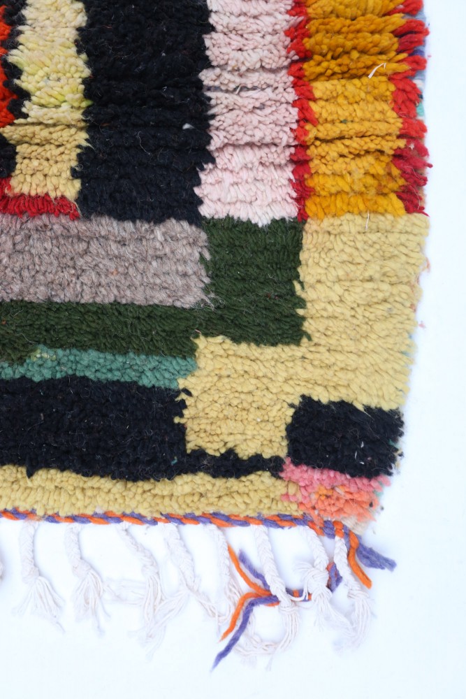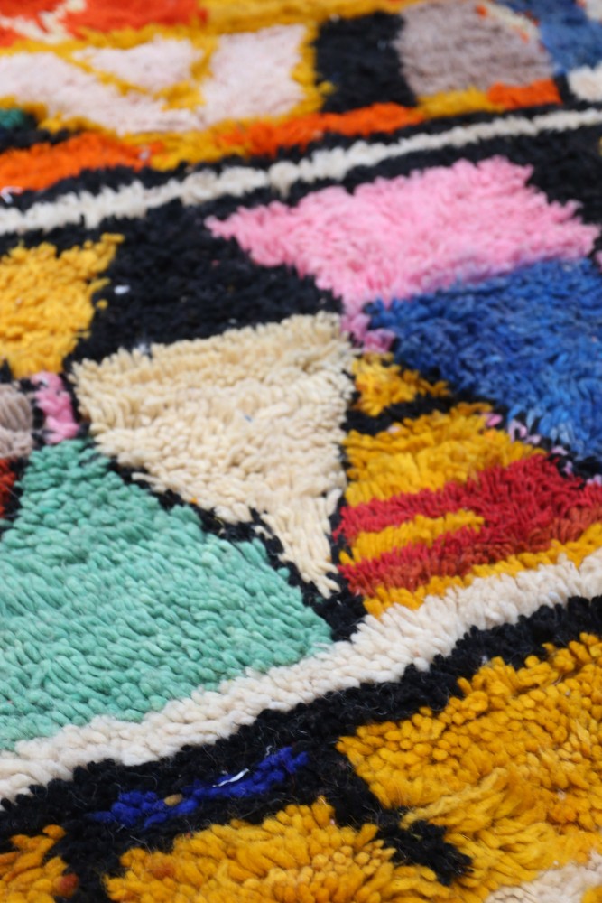 Deze Berberse tapijt genaamd Azilal dankt zijn naam aan de regio Azilal in Marokko waar het met de hand is geweven op een traditioneel houten weefgetouw. De patronen vertegenwoordigen de stemmingen, liefdes en verdriet van de weefster op het moment van creatie. Nadat dit gekleurde Berberse tapijt is gemaakt, zal ze een volledig ander tapijt maken, afhankelijk van haar emoties op dat moment. Elk stuk is dus uniek.