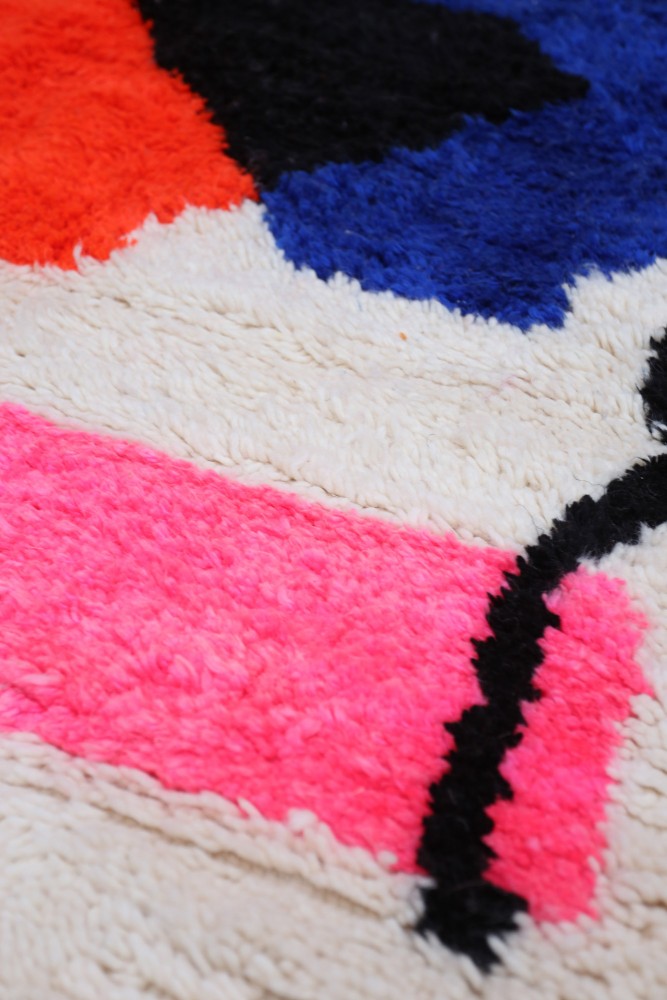 Deze Berberse tapijt genaamd Azilal dankt zijn naam aan de regio Azilal in Marokko waar het met de hand is geweven op een traditioneel houten weefgetouw. De patronen vertegenwoordigen de stemmingen, liefdes en verdriet van de weefster op het moment van creatie. Nadat dit gekleurde Berberse tapijt is gemaakt, zal ze een volledig ander tapijt maken, afhankelijk van haar emoties op dat moment. Elk stuk is dus uniek.