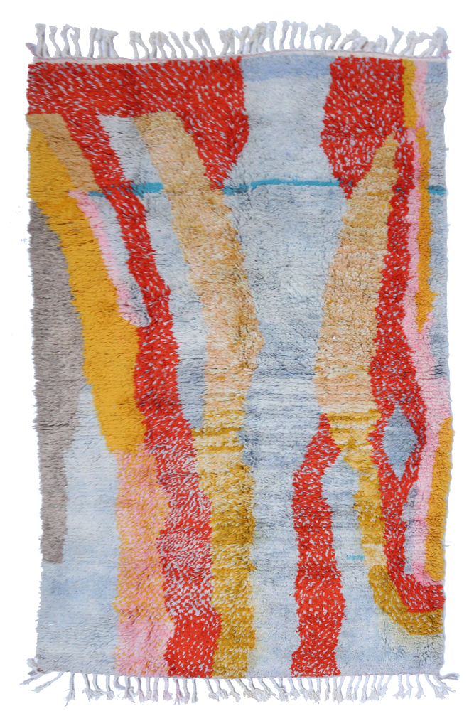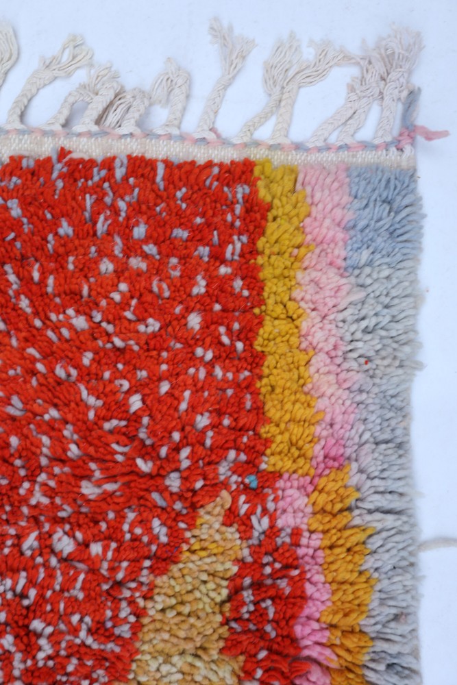 Deze Berberse tapijt genaamd Azilal dankt zijn naam aan de regio Azilal in Marokko waar het met de hand is geweven op een traditioneel houten weefgetouw. De patronen vertegenwoordigen de stemmingen, liefdes en verdriet van de weefster op het moment van creatie. Nadat dit gekleurde Berberse tapijt is gemaakt, zal ze een volledig ander tapijt maken, afhankelijk van haar emoties op dat moment. Elk stuk is dus uniek.