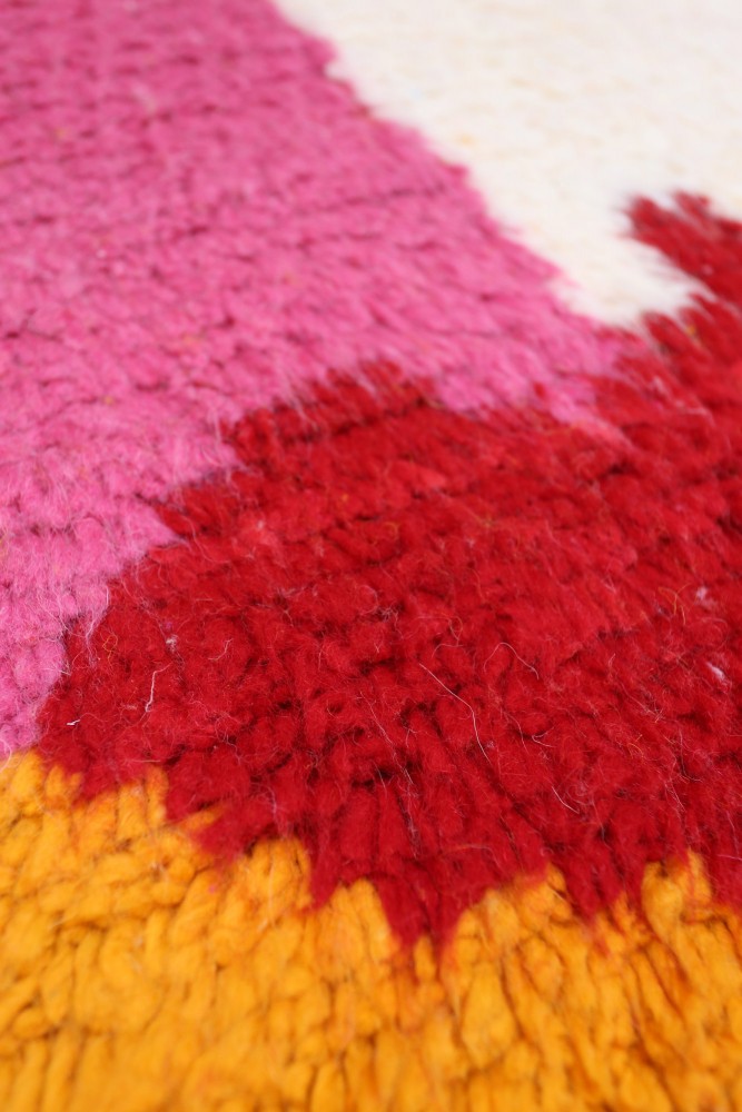 Deze Berberse tapijt genaamd Azilal dankt zijn naam aan de regio Azilal in Marokko waar het met de hand is geweven op een traditioneel houten weefgetouw. De patronen vertegenwoordigen de stemmingen, liefdes en verdriet van de weefster op het moment van creatie. Nadat dit gekleurde Berberse tapijt is gemaakt, zal ze een volledig ander tapijt maken, afhankelijk van haar emoties op dat moment. Elk stuk is dus uniek.