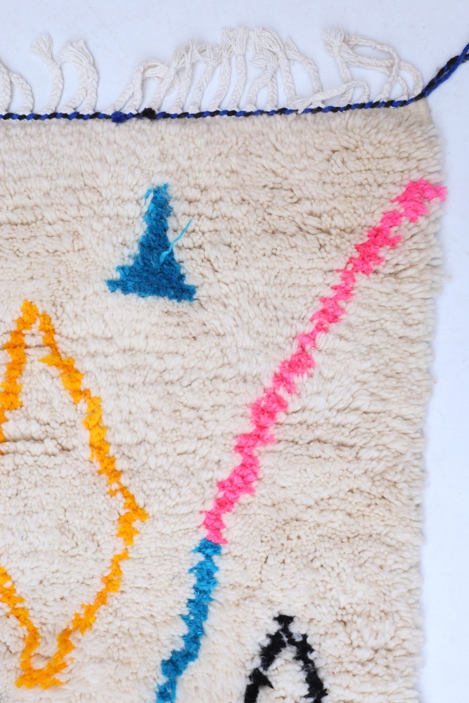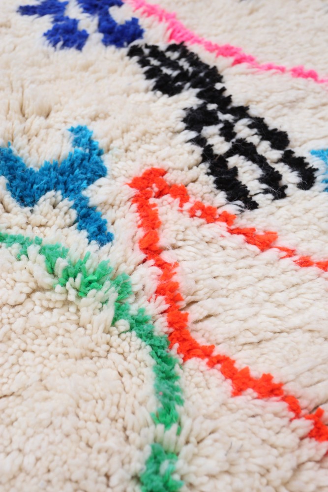Deze Berberse tapijt genaamd Azilal dankt zijn naam aan de regio Azilal in Marokko waar het met de hand is geweven op een traditioneel houten weefgetouw. De patronen vertegenwoordigen de stemmingen, liefdes en verdriet van de weefster op het moment van creatie. Nadat dit gekleurde Berberse tapijt is gemaakt, zal ze een volledig ander tapijt maken, afhankelijk van haar emoties op dat moment. Elk stuk is dus uniek.