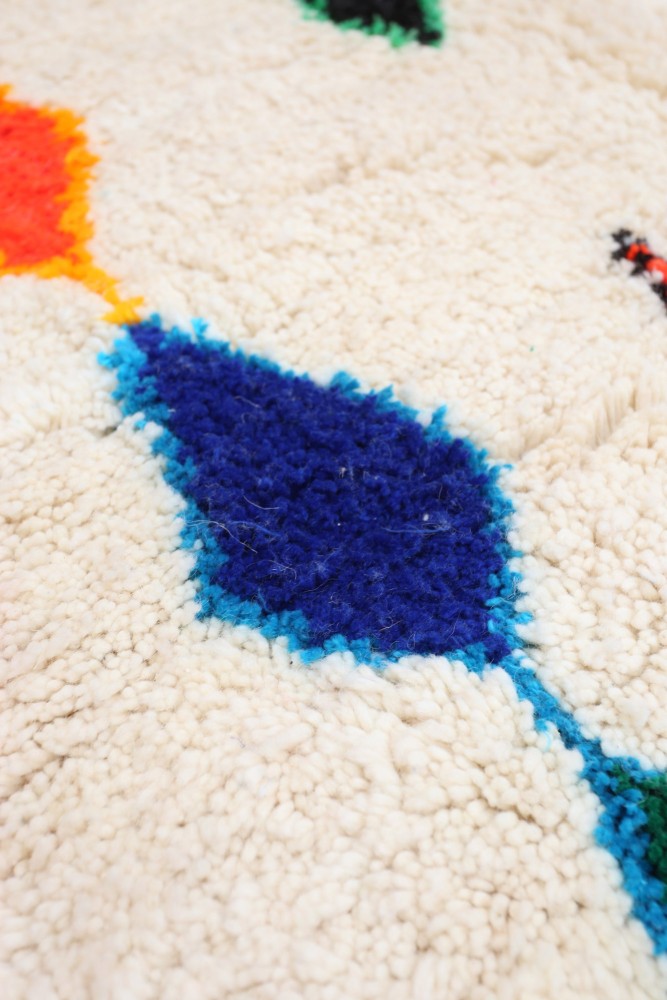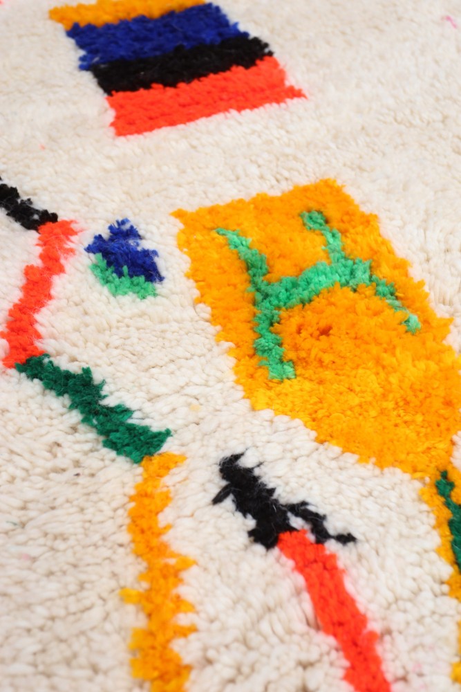 Deze Berberse tapijt genaamd Azilal dankt zijn naam aan de regio Azilal in Marokko waar het met de hand is geweven op een traditioneel houten weefgetouw. De patronen vertegenwoordigen de stemmingen, liefdes en verdriet van de weefster op het moment van creatie. Nadat dit gekleurde Berberse tapijt is gemaakt, zal ze een volledig ander tapijt maken, afhankelijk van haar emoties op dat moment. Elk stuk is dus uniek.