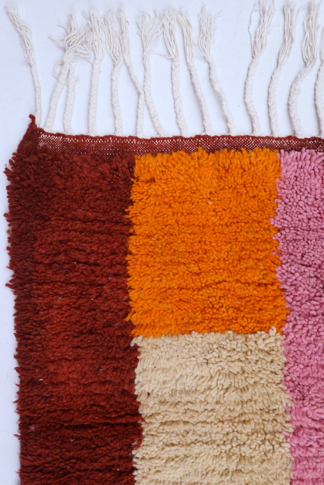 Deze Berberse tapijt genaamd Azilal dankt zijn naam aan de regio Azilal in Marokko waar het met de hand is geweven op een traditioneel houten weefgetouw. De patronen vertegenwoordigen de stemmingen, liefdes en verdriet van de weefster op het moment van creatie. Nadat dit gekleurde Berberse tapijt is gemaakt, zal ze een volledig ander tapijt maken, afhankelijk van haar emoties op dat moment. Elk stuk is dus uniek.