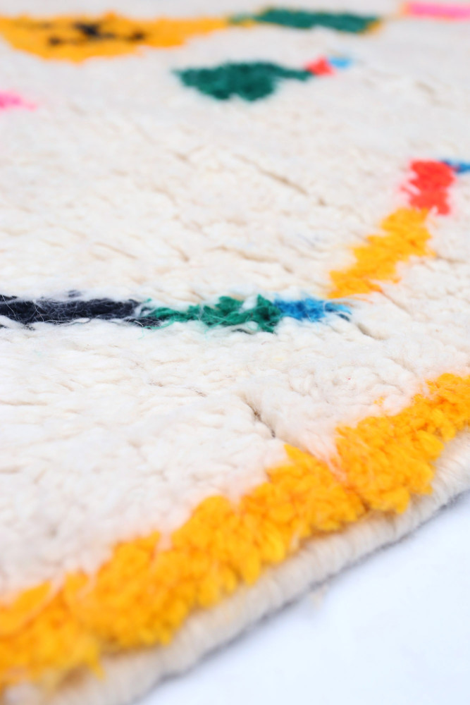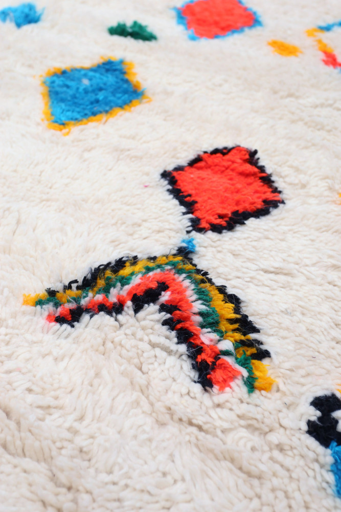 Deze Berberse tapijt genaamd Azilal dankt zijn naam aan de regio Azilal in Marokko waar het met de hand is geweven op een traditioneel houten weefgetouw. De patronen vertegenwoordigen de stemmingen, liefdes en verdriet van de weefster op het moment van creatie. Nadat dit gekleurde Berberse tapijt is gemaakt, zal ze een volledig ander tapijt maken, afhankelijk van haar emoties op dat moment. Elk stuk is dus uniek.