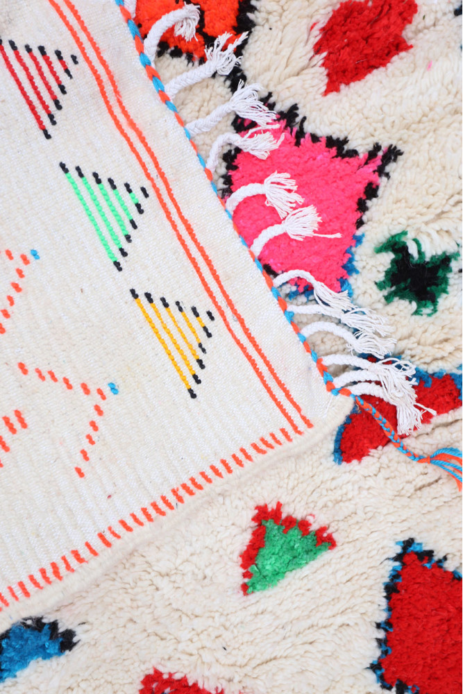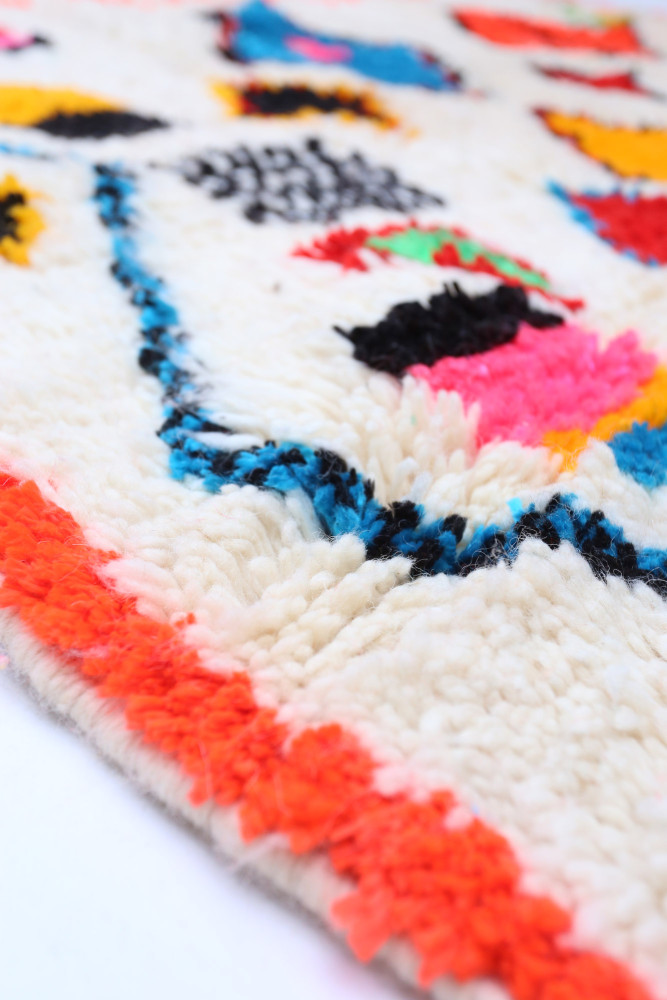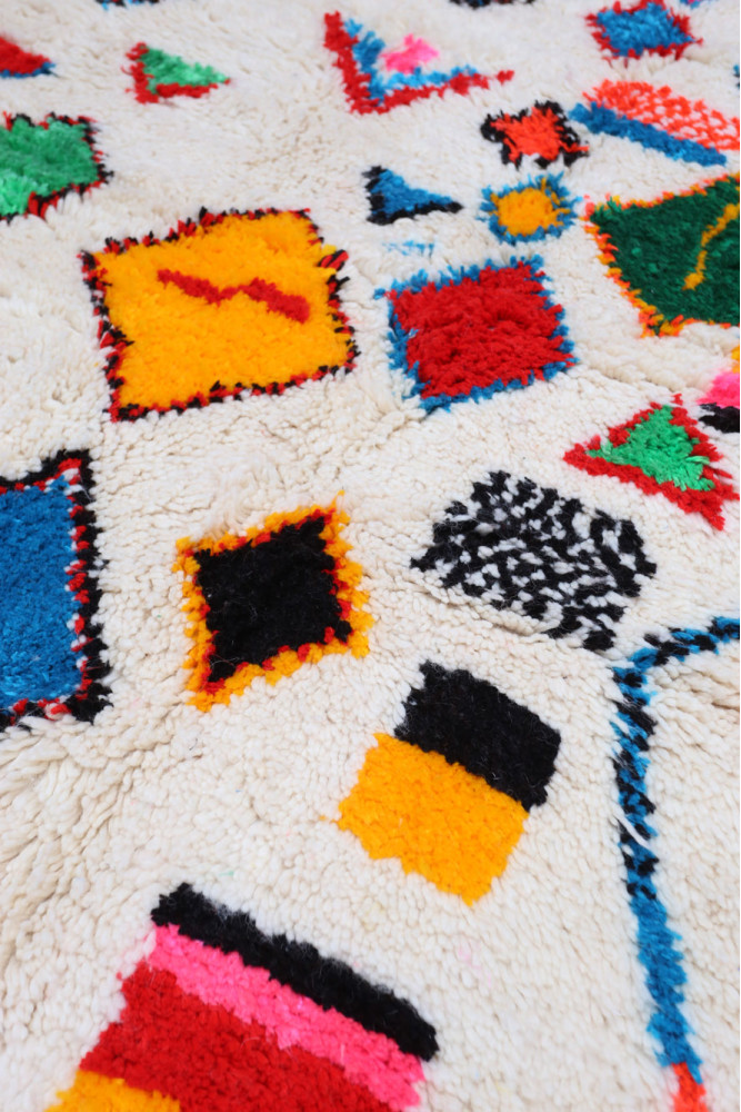 Deze Berberse tapijt genaamd Azilal dankt zijn naam aan de regio Azilal in Marokko waar het met de hand is geweven op een traditioneel houten weefgetouw. De patronen vertegenwoordigen de stemmingen, liefdes en verdriet van de weefster op het moment van creatie. Nadat dit gekleurde Berberse tapijt is gemaakt, zal ze een volledig ander tapijt maken, afhankelijk van haar emoties op dat moment. Elk stuk is dus uniek.