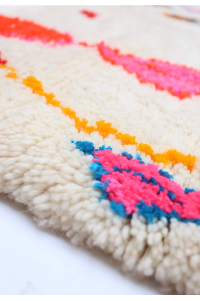 Deze Berberse tapijt genaamd Azilal dankt zijn naam aan de regio Azilal in Marokko waar het met de hand is geweven op een traditioneel houten weefgetouw. De patronen vertegenwoordigen de stemmingen, liefdes en verdriet van de weefster op het moment van creatie. Nadat dit gekleurde Berberse tapijt is gemaakt, zal ze een volledig ander tapijt maken, afhankelijk van haar emoties op dat moment. Elk stuk is dus uniek.