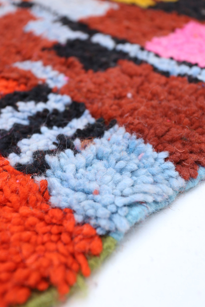 Deze Berberse tapijt genaamd Azilal dankt zijn naam aan de regio Azilal in Marokko waar het met de hand is geweven op een traditioneel houten weefgetouw. De patronen vertegenwoordigen de stemmingen, liefdes en verdriet van de weefster op het moment van creatie. Nadat dit gekleurde Berberse tapijt is gemaakt, zal ze een volledig ander tapijt maken, afhankelijk van haar emoties op dat moment. Elk stuk is dus uniek.