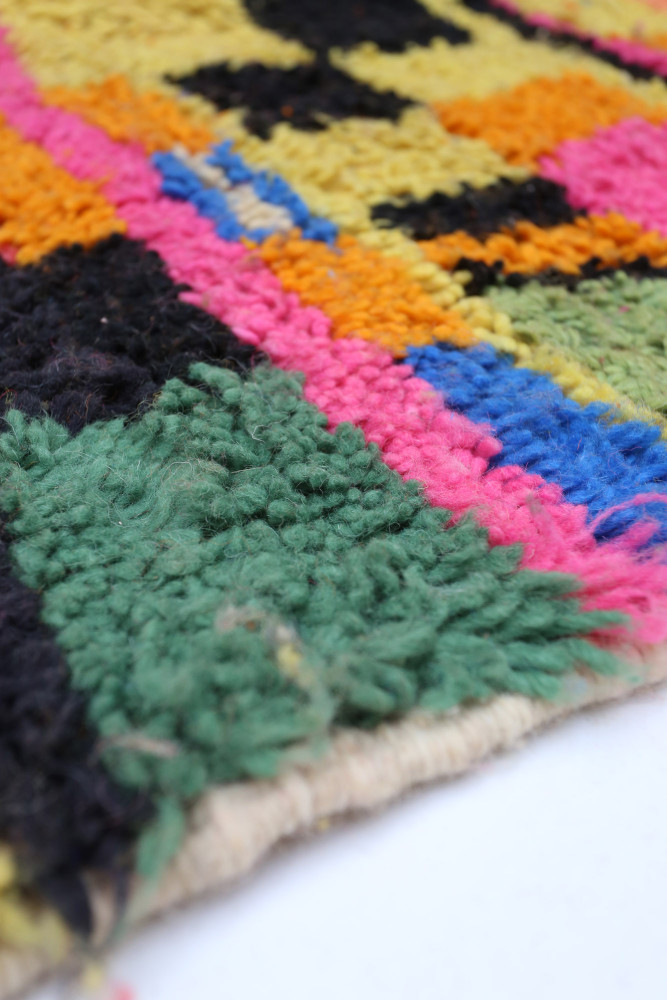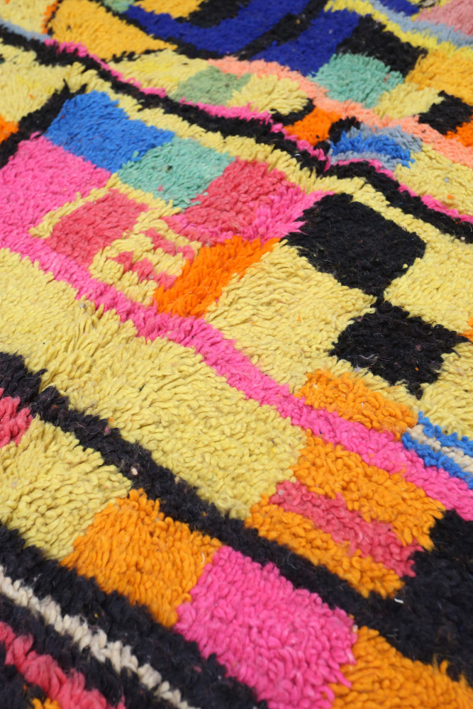 Deze Berberse tapijt genaamd Azilal dankt zijn naam aan de regio Azilal in Marokko waar het met de hand is geweven op een traditioneel houten weefgetouw. De patronen vertegenwoordigen de stemmingen, liefdes en verdriet van de weefster op het moment van creatie. Nadat dit gekleurde Berberse tapijt is gemaakt, zal ze een volledig ander tapijt maken, afhankelijk van haar emoties op dat moment. Elk stuk is dus uniek.
