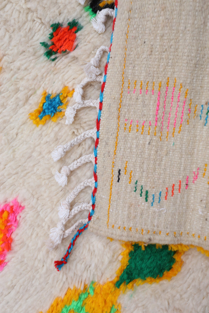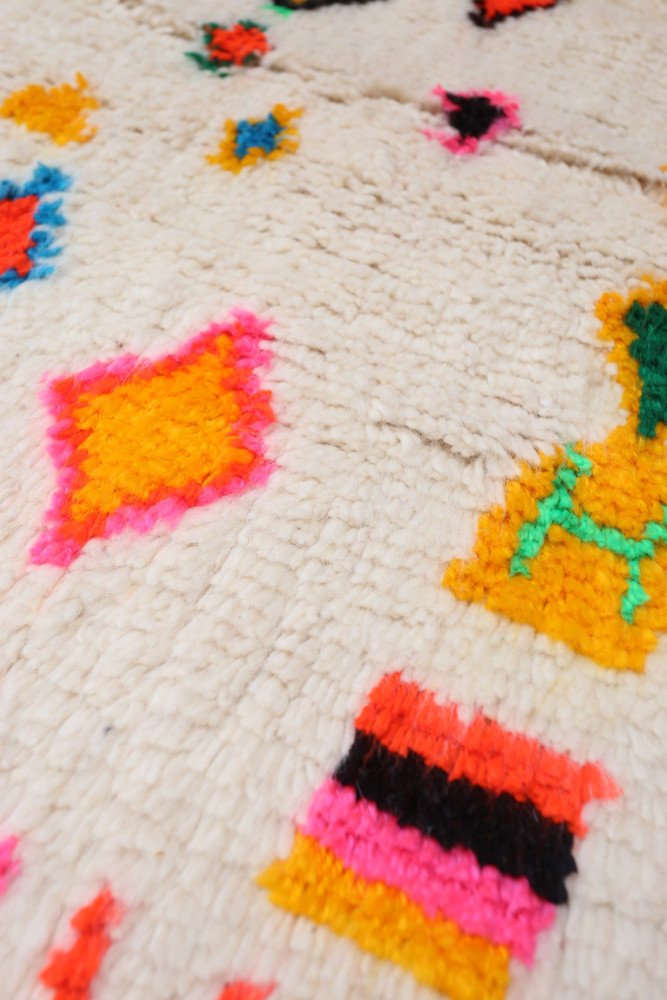Deze Berberse tapijt genaamd Azilal dankt zijn naam aan de regio Azilal in Marokko waar het met de hand is geweven op een traditioneel houten weefgetouw. De patronen vertegenwoordigen de stemmingen, liefdes en verdriet van de weefster op het moment van creatie. Nadat dit gekleurde Berberse tapijt is gemaakt, zal ze een volledig ander tapijt maken, afhankelijk van haar emoties op dat moment. Elk stuk is dus uniek.
