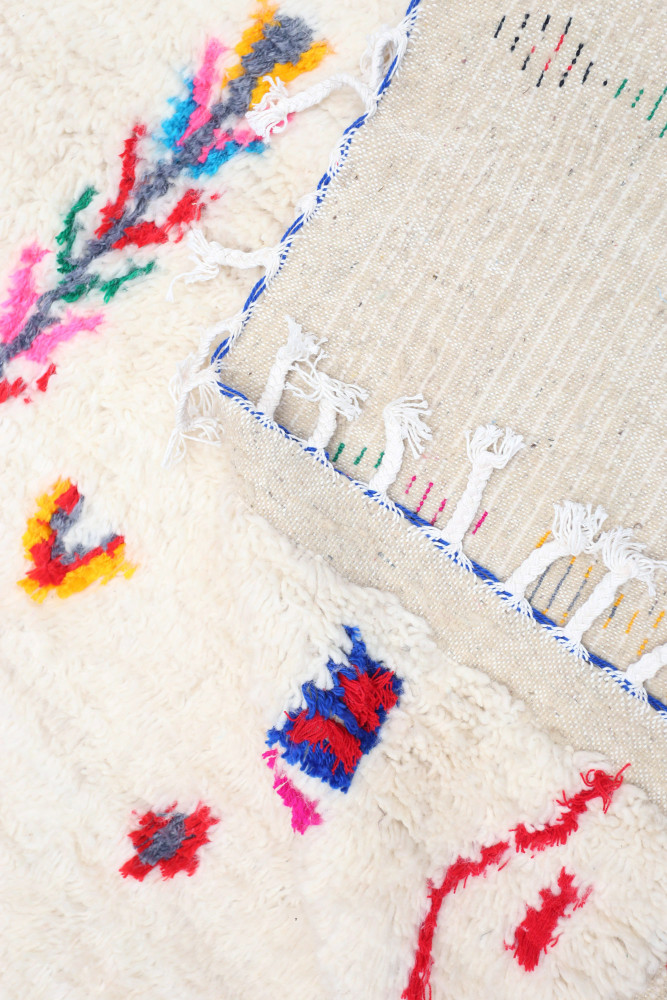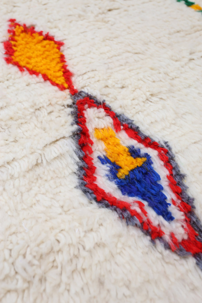 Deze Berberse tapijt genaamd Azilal dankt zijn naam aan de regio Azilal in Marokko waar het met de hand is geweven op een traditioneel houten weefgetouw. De patronen vertegenwoordigen de stemmingen, liefdes en verdriet van de weefster op het moment van creatie. Nadat dit gekleurde Berberse tapijt is gemaakt, zal ze een volledig ander tapijt maken, afhankelijk van haar emoties op dat moment. Elk stuk is dus uniek.