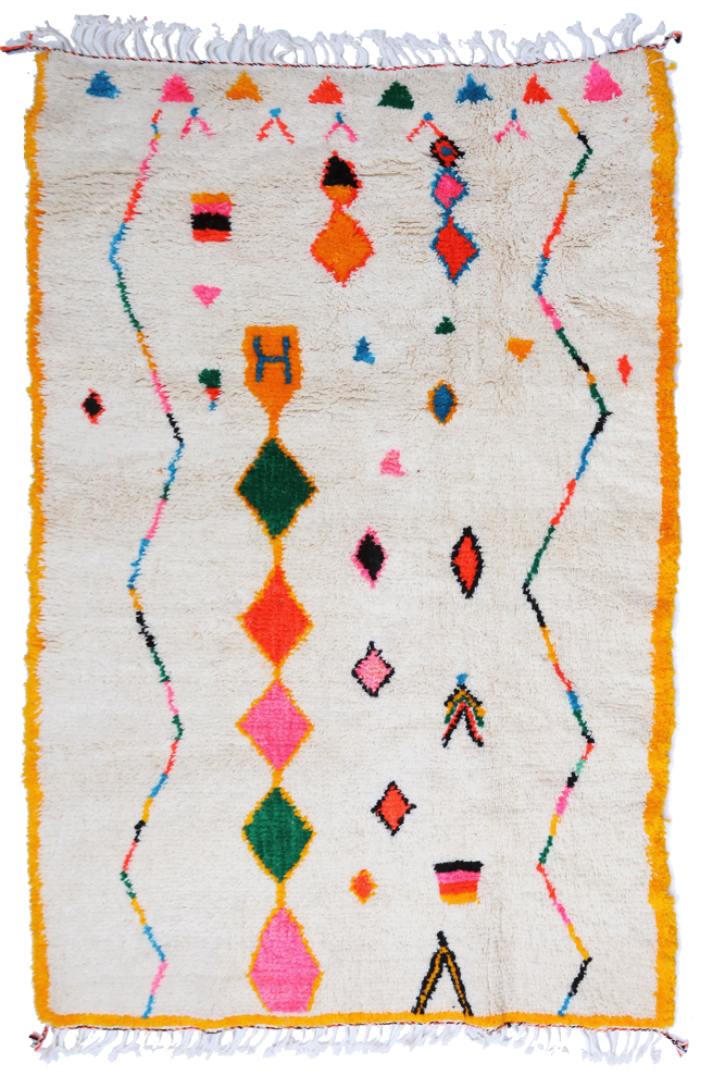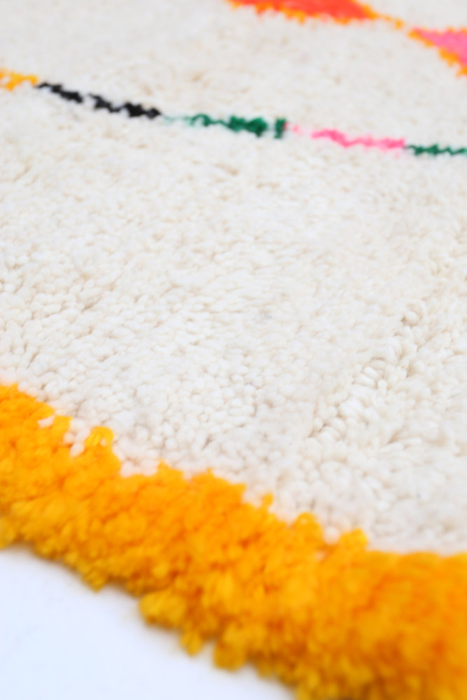 Deze Berberse tapijt genaamd Azilal dankt zijn naam aan de regio Azilal in Marokko waar het met de hand is geweven op een traditioneel houten weefgetouw. De patronen vertegenwoordigen de stemmingen, liefdes en verdriet van de weefster op het moment van creatie. Nadat dit gekleurde Berberse tapijt is gemaakt, zal ze een volledig ander tapijt maken, afhankelijk van haar emoties op dat moment. Elk stuk is dus uniek.