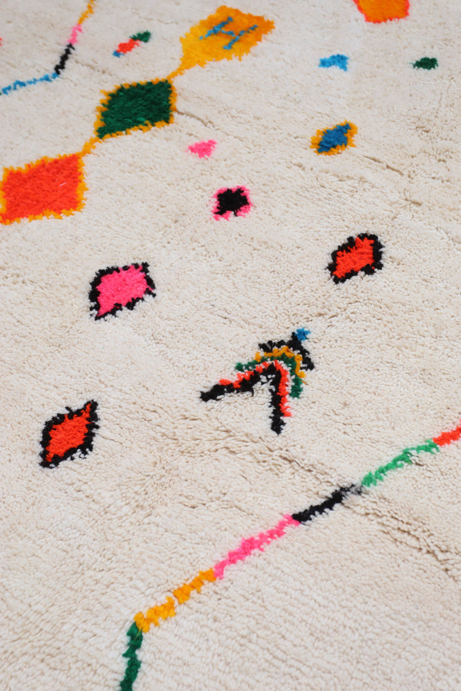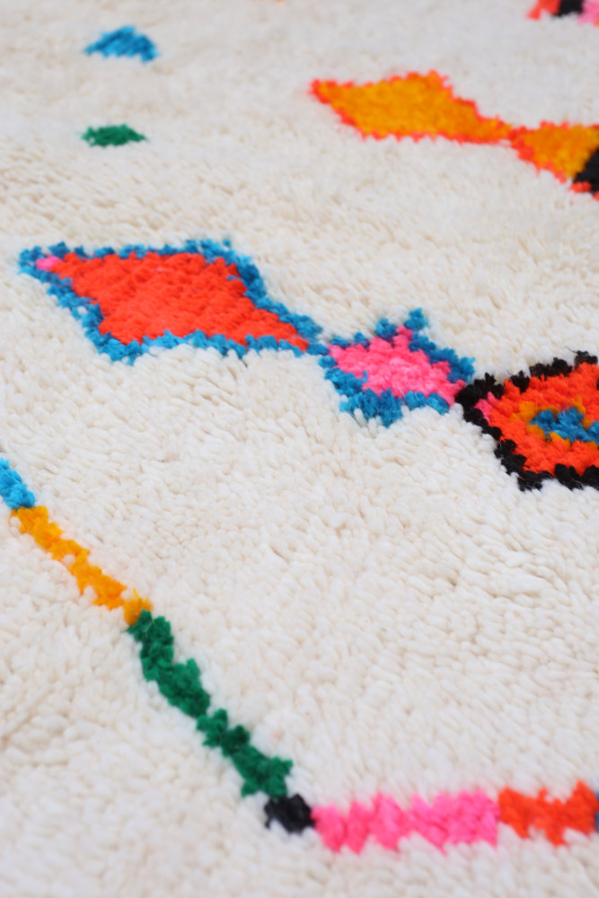 Deze Berberse tapijt genaamd Azilal dankt zijn naam aan de regio Azilal in Marokko waar het met de hand is geweven op een traditioneel houten weefgetouw. De patronen vertegenwoordigen de stemmingen, liefdes en verdriet van de weefster op het moment van creatie. Nadat dit gekleurde Berberse tapijt is gemaakt, zal ze een volledig ander tapijt maken, afhankelijk van haar emoties op dat moment. Elk stuk is dus uniek.