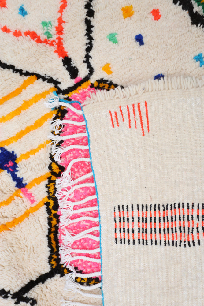 Deze Berberse tapijt genaamd Azilal dankt zijn naam aan de regio Azilal in Marokko waar het met de hand is geweven op een traditioneel houten weefgetouw. De patronen vertegenwoordigen de stemmingen, liefdes en verdriet van de weefster op het moment van creatie. Nadat dit gekleurde Berberse tapijt is gemaakt, zal ze een volledig ander tapijt maken, afhankelijk van haar emoties op dat moment. Elk stuk is dus uniek.