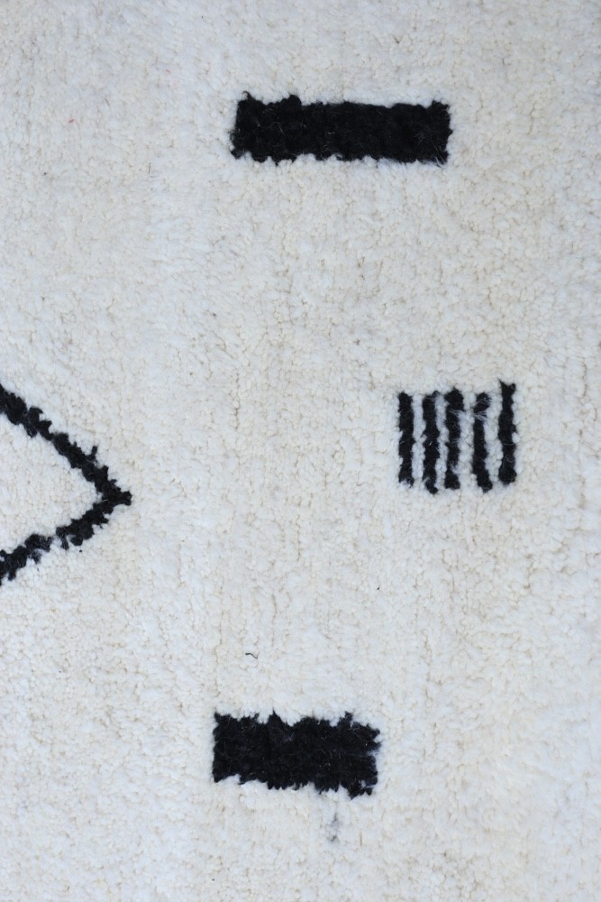 Beni Ouarain wit Berber-tapijt met zwarte asymmetrische motieven en lijnen van wol.