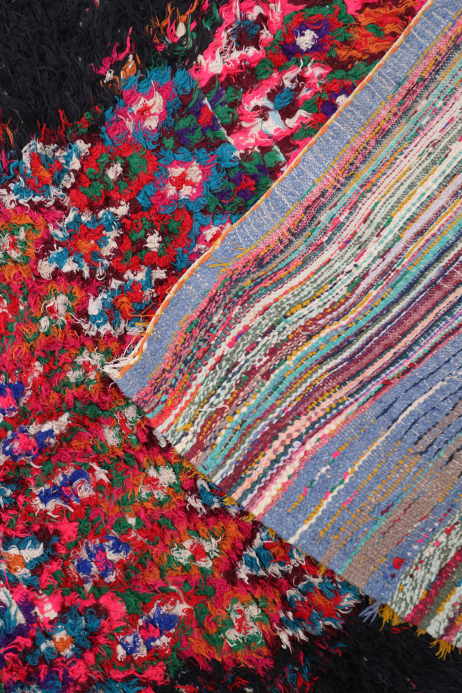 Boucherouite tapijt gemaakt van gerecycled textiel, met de hand geweven op een traditioneel weefgetouw in de bergen van de Atlas in Marokko.