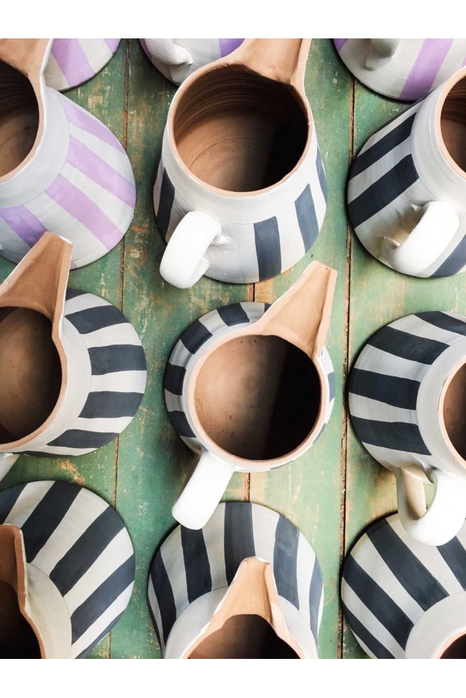Keramische kan met zwart-witte strepen, ambachtelijk gemaakt in Portugal.