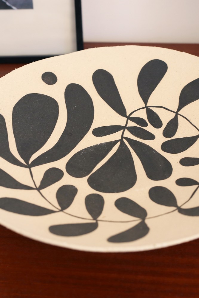 Voetkom van steengoed met een zwart patroon van een blad, ambachtelijk vervaardigd in Parijs.