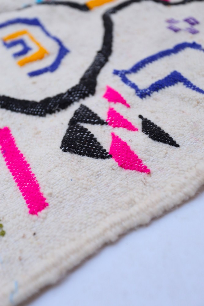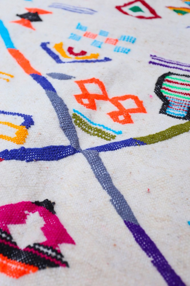 Deze Berberse tapijt genaamd Azilal dankt zijn naam aan de regio Azilal in Marokko waar het met de hand is geweven op een traditioneel houten weefgetouw. De patronen vertegenwoordigen de stemmingen, liefdes en verdriet van de weefster op het moment van creatie. Nadat dit gekleurde Berberse tapijt is gemaakt, zal ze een volledig ander tapijt maken, afhankelijk van haar emoties op dat moment. Elk stuk is dus uniek.