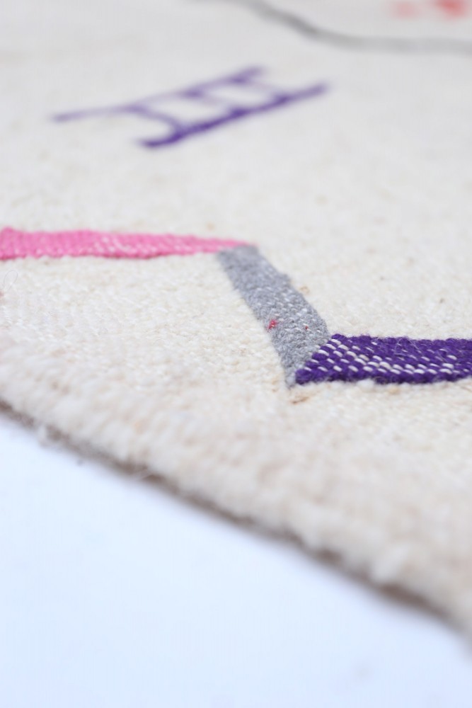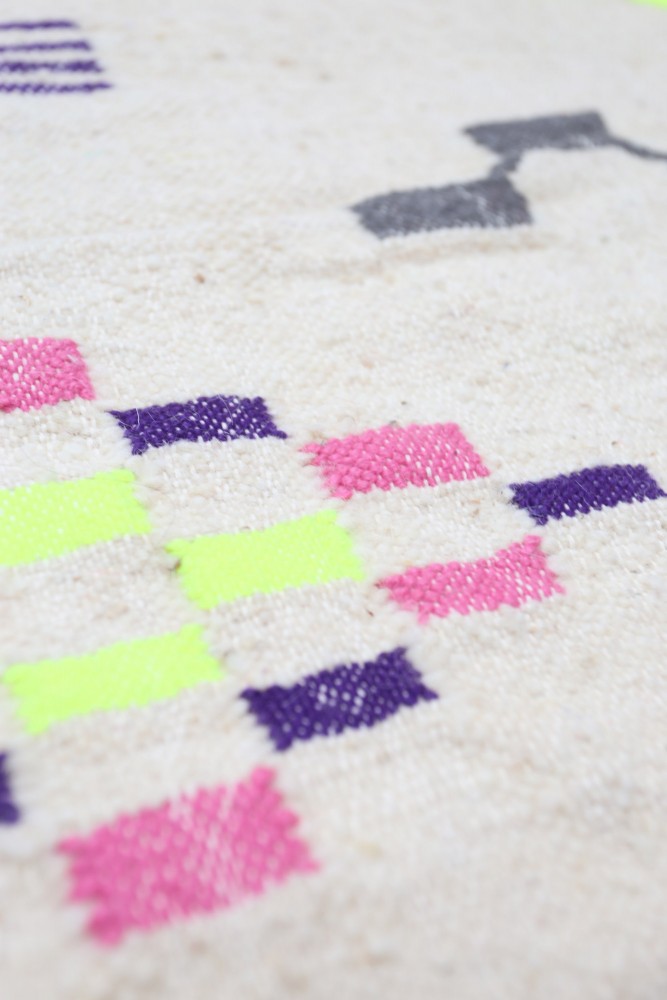 Deze Berberse tapijt genaamd Azilal dankt zijn naam aan de regio Azilal in Marokko waar het met de hand is geweven op een traditioneel houten weefgetouw. De patronen vertegenwoordigen de stemmingen, liefdes en verdriet van de weefster op het moment van creatie. Nadat dit gekleurde Berberse tapijt is gemaakt, zal ze een volledig ander tapijt maken, afhankelijk van haar emoties op dat moment. Elk stuk is dus uniek.