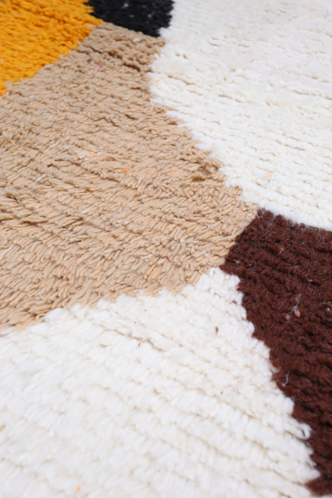 Deze Berberse tapijt genaamd Azilal dankt zijn naam aan de regio Azilal in Marokko waar het met de hand is geweven op een traditioneel houten weefgetouw. De patronen vertegenwoordigen de stemmingen, liefdes en verdriet van de weefster op het moment van creatie. Nadat dit gekleurde Berberse tapijt is gemaakt, zal ze een volledig ander tapijt maken, afhankelijk van haar emoties op dat moment. Elk stuk is dus uniek.